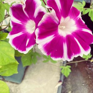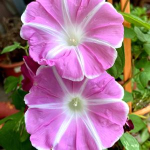 曜白朝顔が咲き進んでます。 いつも白い線は5本なのに、6本のが咲いていた😆 中心部分に入るボカシからの星模様(?)も綺麗〜😍💕 曜白朝顔、大好きです!💕