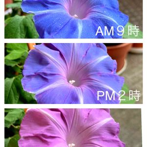 曜白朝顔の一日の色の変化❗️ 朝と夕では別の朝顔の様‼️ 普段は暑さの為に夕方は萎んで しまいますが、台風が近づいて 気温が下がっていたので夕方まで 開いていました💙💜💗 🏷青い朝顔マニア に参加させてください💕