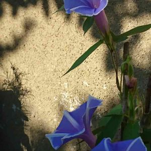 木陰からの朝日を待ち受ける 朝顔 曜白 🌼✨ ブルー おはようございます☀️ 花壇に地植えしてる朝顔は、 まだまだ元気です✨ 台風一過☀️ 今朝は とても涼しいです😄 今日も一日、ボチボチ頑張りましょう✨