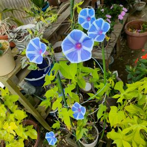 おはよー(*^ω^)ノ ございま〜す 今朝はめっちゃ涼しくて らくですね〜🎐...♪*゚ さて今朝は ①朝顔が4つ 1度に咲きました💜💙 色はこの2色だけ みたい😅 ②昨日の✂️した ビアホップを植えました 🪴🪴 茎の根元のポロポロ 外した葉も蒔きました