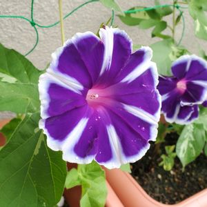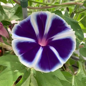 💙💜アサガオ💜💙 曜白アサガオさん💕 🩷ばかり咲いていましたが、 💜💙が咲き、綺麗なカラーに うっとり✨✨嬉しいです💕 グリーンカーテン用に植えていた、曜白アサガオの3種類が咲揃ってきました💓 軒下まで到達しましたが、上の方は葉っぱが少なめ、花は下より沢山咲いてます😄 西日を受ける場所なので、昼間の葉っぱは萎れて枯れそうな状態😓 夕方水やりで元気に回復、よくここまで育ったなぁと感心します❣️