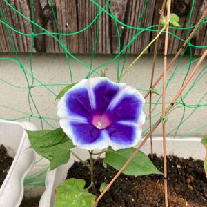 アサガオが咲きました♪ 去年テキトーに採ったタネをいろいろまきました。同じプランターに数種類😆 その中でいちばん最初にアサガオが咲きました♪