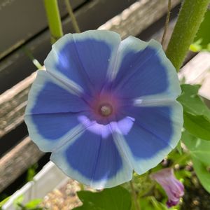 今年も曜白朝顔が咲き始めました💠 去年の子は薄いピンクとブルーの2種類だったのですが、お婿さんからもらった種からは、濃い色が咲きました🎵 たくさんのお花が咲いてくれるかな😊