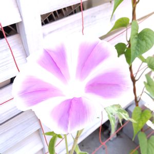 曜白朝顔、早くも咲いていました💕 根元の低い位置で、葉に囲まれて 綺麗に開き切れない感じですが とても可愛いです💕 明日、更にひとつ咲きそうです😊 今日は伸びた蔓をピンチしました!