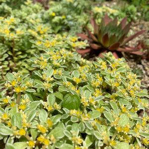 多肉花壇にしたかったところが、斑入り丸葉万年草に占拠されていってます😅 お花が満開で可愛いけども😆 埋もれていく小さな多肉たち…