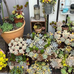 ガレージの壁際ガーデン記録! その③ 仕立て直した寄せ植えもモリモリになり紅葉してた多肉もグリーンに変わり色合いが冬色から春夏色に❤️💚