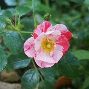 フラワーカーペットローズ🌹ピンクスプラッシュ うどん粉、黒星病に強く、乾燥強、耐寒性-10°、樹勢強、強健種。 樹高60〜80㌢、四季咲き、横張、丸弁平咲、花径4㌢、花房15〜18輪。 去年の9月にカーマで438円で購入。 今年初開花です😆✨ 絞りが可愛いです😍