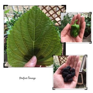 今日の収穫です🍇 マルベリーは毎日10個ずつぐらい熟していってます。 ピーマンは1番最初の実は小さいうちにとらないといけないと聞いたので、収穫しました😢 エゴマに虫食いがついていたので収穫がてら切っておきました💦