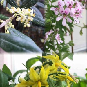 開花ラッシュです😆 3年育てているローズゼラニウムは満開です🌸 今年が1番きれいに咲きました♪ オリーブはマンザニロもアルベキーナも咲いてたので、実がなるかも🤩 トマトもオリーブも早く食べたい😆