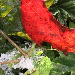 いよいよ白い結晶が❄️️ 舞い降りてきました 真っ赤な落ち葉と 緑の葉っぱと 白い雪 美しい朝の庭でした✨