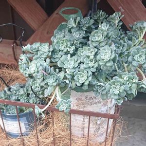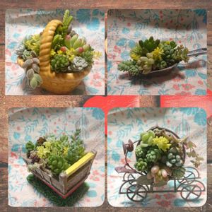 こんばんは。 購入した小物にチマチマ寄せ植えしました😆 陶器バスケット、アルミスプーン、陶器の台車、ワイヤーの馬車 穴が開けられなかった物ばかりで、今回はネルソルを使いました。