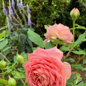 おはようございます😊 🌹ジュビリー・セレブレーション (手前) 💜ベロニカ ロンギフォリア ブルーシェーズ (後ろ) お二人さん、順調に大きくなっています✨ (*ˊᵕˋ*)੭ ੈ❤︎ ベロニカは、もっと開花が進んできたら、 またupさせていただきたいと思います☺️💜✨ ♡★♡゚・*:.。 。.:*・゚♡★♡゚