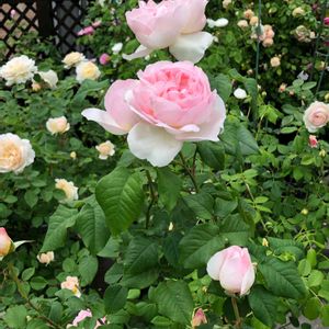イングリッシュローズ🌹 モーティマー サックラー 今年は挿し木苗で3年目だいぶ大きくなりました〜バラの苗さん から挿し木してみたらと言われ2本は成功しました、今までのイングリッシュローズのイメージとはだいぶ違っていますね、棘も少ないしステムが細くて長い 育てやすい バラかも…🤔😊