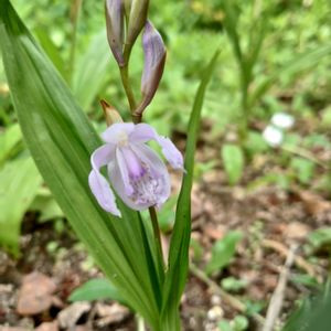シラン(青花)。2019年に苗を購入して地植え。一般的な紫に比べて地味で楚々とした雰囲気。植えてある場所の違い(こちらの方が日が当たらず、湿った場所)なのか品種の違いなのか、紫に比べてあまり増えません。