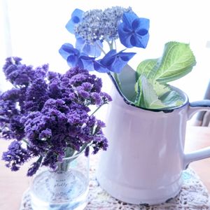 *紫陽花💙 *スターチス💜 *ペペロミア グリーンバレー🌿 育てた事もない💙切り花で1本もらいました☺ 小さな🔵は咲くのかなぁ~? 🌿3~4月頃にお迎え 肉厚な葉と、独特の葉脈の葉も可愛く感じます♡ 間延びしてるようなので✂️しようかな🙄