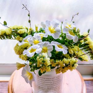 🤍💛💚ぽいコたち ①② *ハニーヨーグルト🌸PW *スターチス ③ゴールドウィン・お花☘️ ④ワイヤープランツ・お花🌿 ①② 切り戻ししたお花と、ドライ用に買った切り花💛 ビンに生けてみた。 ③ 6月下旬、picしたコ お花が咲いたよ😊 ④ いつも上手く撮れないけどお花💚これから白っぽくなり実がつくのかな?🙄