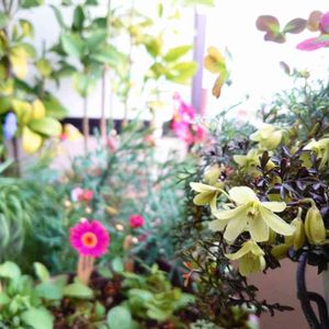 去年迎えた クレマチスペトリエイが咲いたー(,,> <,,)♡ ミカンの木の根本に放置してるムスカリも咲いて、 外は雨模様だけど たーぼー*のベランダは春爛漫💓
