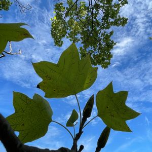 ユリノキ(百合の木)の花が咲いていました。 モクレン科の落葉高木で、花は少し見付けにくいです✨ 別名チューリップツリーで、チュ-リップのような形をしています🎶 花弁は黄緑色、基部にオレンジ色の班紋があります💕 ただ目視するのが難しいので、よく観察ができません😥