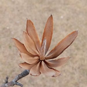 百合の木(ユリノキ) モクレン科ユリノキ属の落葉高木。北アメリカ原産。明治時代初期に日本に入り、1875年(明治8年)、新宿御苑に植樹されたのが日本初という。高さ30mにもなる木で、成長がよく公園樹や街路樹として広く植えられる。幅広の葉は滑らかで薄くて硬く、掌状に浅く4または6裂し、長さ3~6㎝の長い葉柄を持ち互生する。花期は5~6月。花はチューリップに似た鐘形花で直径5~6㎝。雄しべは線形で花床下部に、雌しべは花床に多数つく。花被片は9枚で、外側の緑白色の萼片3枚が反り返る。花弁のオレンジ色のラインから蜜が出る。秋には葉が濃い黄色に黄葉し鮮やかだが、すぐに褐色化しやすい。果実は細長い翼果が集まり松かさ状となった集合果で秋に熟す。上向きにつき、翼果はくるくる回転しながら落下する。種子は翼果の付け根のかぎ状部分にある。1~2個つくが秕(しいな)も多い。北アメリカでは蜜源植物として利用される。ネイティブ・アメリカンは本種の材でカヌーを作り、棺桶にも用いたという。 名前は、ギリシャ語の『ユリ』と『樹木』を合わせた属名に由来する。属名のユリの由来は、花の構造がユリの花に似ているためと思われる。学名の種小名『tulipifera』はチューリップのことなので、チューリップの木とも呼ばれる。英名は『Tulip Tree』という。別名の半纏木(ハンテンボク)は左右対称の葉の形を半纏に見立てた名前。 出典『葉っぱで見わけ五感で楽しむ樹木図鑑』『樹木の事典 600種』『樹木の名前』