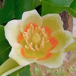 🌲💛🧡💚樹に咲く花💚🧡💛🌲 橙色の斑点をもつ黄緑色の花 中央に雌蕊があり その下部から多数の雄蕊がある ※花弁にある橙色の部分から 蜜を生じ ハチミツの蜜源となる 百合の木 モクレン科 別名 チューリップツリー
