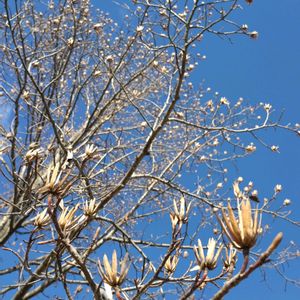 おはようございます 今日は雨です💚 雨の日に青空のpic🌳😘 牧野植物園のユリノキ この日はお天気は悪かったのにここは青空が🎵 雨がポツンと落ちてきたのですが、ユキワリイチゲもなんと開いてました💜💓 ユリノキは背が高くまだお花は見た事がありません💚