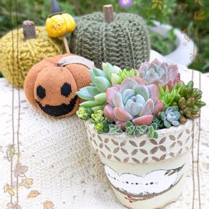 おはようございます😊 今日はハロウィン🍬👻🎃ですね カボチャの後ろの2つは maronchanが編んでくれました😀 とっても綺麗に編んであって可愛いです〜⸜(*ˊᗜˋ*)⸝💓 可愛いシマエナガの鉢に、久しぶりの 寄せ植えを作ってみました〜😋💕 🏷ハロウィン月間🎃