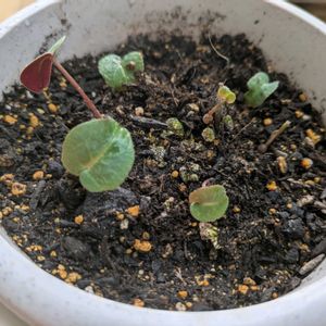 シクラメン こぼれ種から芽が出ました 夏越しに失敗したのか球根は溶けちゃったみたい この可愛い芽、どうやって育てたら? 教えてください、お願い🙇