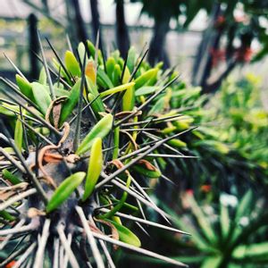 《アローディア プロセラ》 緑色の小判状の葉と背骨のような灰白色の茎が特徴です。プロセラの棘はサボテンの棘とは異なり、樹皮の一部が突出したものらしいです。でも、やっぱり刺さると痛いです‼️