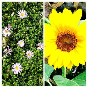 ⬅️何の芽が出てるのかなぁ🌱育ててみたら小さな可愛いお花がいっぱい咲きました💜 ➡️小鳥のごはんのヒマワリの種が育ちました🤭夏の終わりに咲きました💛 どちらも9月10日に撮りました☀️
