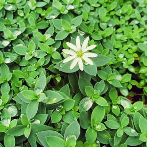 シコタンハコベ🌼 どんどん広がり年中引っこ抜いてます😅 今朝は昨夜の☔で葉っぱに雫、キラキラ❇️ 一輪だけ咲いてます😲 先日の暑さで勘違いしたのかな⁉️
