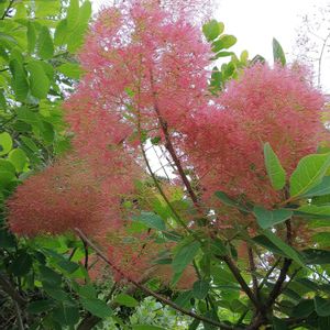 青虫に襲われて葉っぱが水玉になっていたスモークツリーさん。 ホワホワし始めました🌹 奥の紫陽花も色づいてお庭が賑やかになってきました🎶 まだまだ虫たちと共存しつつ花を咲かせていきたいと思います