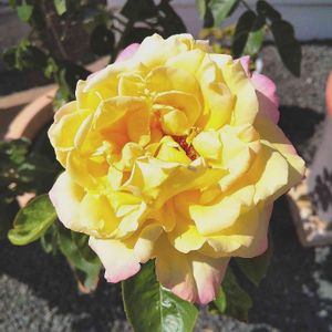 薔薇 ピースです🌹🌿 平和の祈りを捧げるために名付けられました🙏 ピースは黄色に縁取りが桃色を帯びた大輪花を咲かせます💛💗 🏷㊗️cucoさん500pic 🏷㊗️**花ママ**さん3500pic 🏷月曜日にはバラを 🏷幸せの黄色いお花