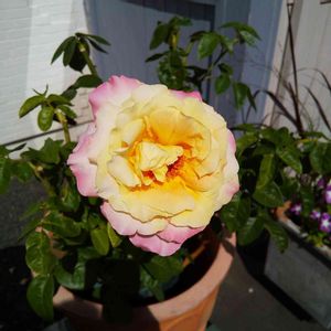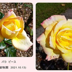 2/27㈯② 薔薇 ピース 『姫野ばら園八ヶ岳農場』さんのとても詳しい記事がありました。 抜粋してまとめてみました。 作出国 フランス 作出者 フランシス メイアン ハイブリッドティ←一本の茎に1輪大輪の花が咲きます。四季咲きで強健です。 巨大輪の先駆的品種。 黄色の花に淡いピンク色の覆輪が入ります。ふっくらとした花容、照りのある大きな葉、良好な花付き、強健な樹勢、良質な性質を多く持ち合わせています。 フランシス氏が母のクラウディアさんに捧げた薔薇で、初めの名前は 《マダム アントワーヌ メイアン》 第二次世界大戦の時代に作出され、戦禍の中一度無くなりかけましたが、アメリカで密かに保存され、イタリア、ドイツにも芽が送られ、一度消息を絶ちましたが密かに栽培されていました。 イタリアでの名前は《ジョイア 幸福》 ドイツでの名前は《グローリア ダイ 神の栄光》でした。 Conard Pyle 社が戦後、世界平和を願って《ピース》と命名。 世界中で大ヒットしました。 ピースは交配親としてもよく利用されました。 ピース直径の品種は280品種以上。 孫品種まで含めると膨大な数です。 これらを総称して「ピースファミリー」と呼ばれています。 写真は2018年10月に神代植物公園で撮りました。 蕾は覆輪のピンク色で蕾の時は濃い色でした。