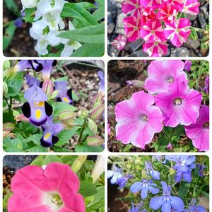 ウチの玄関を彩るお花たち☺️ ① サフィニアプレミアムホワイト白さが際立って涼しげ😌 ②前 レスキュー🛟たち😊 左からサフィニアアート小梅ちゃん・るりいろ風ぐるま・あずきフラッペ。 それぞれ自由に咲いています🎶 ②中 サフィニアフリルライラックブルー。 チラホラ咲きだけど、蕾たくさんでこれから爆咲の予感😌 ②後 アズーロコンパクト3種盛りと2種盛り🥰 どっちもいい具合に混ざって咲いてくれてる🥰 昨年は蒸れで全滅させちゃったから今年は夏越しして秋までは楽しみたいです😌