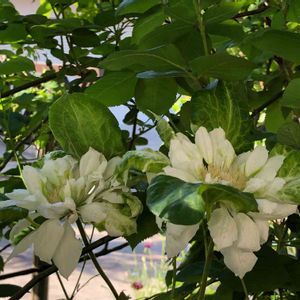 バラ達🌹のアーチの下で密かに かつ大胆に 大きく咲いている クレマチス ダッチェス オブ エジンバラ 一生懸命咲いているのに 目立ちません😅クレマチスにここに植えちゃって 😵ごめんなさいと謝まってます。😥あまりにバラのグリーンに 溶け込んでしまってます😱