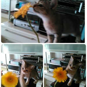 あぁ〜!一輪挿しのガーベラが、(=^・^=)パンチでノックダウンされちゃた!😢