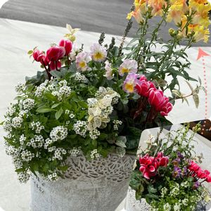久々の寄せ植え。 遠目でもシクラメンはかなり映える! シクラメンはもう少し抑えた色でも良かったかも。 カルーナのグレー色がカッコいい☆ あえてグラッとしたアリッサムを選び枝垂れ風にしたのがポイント。 金魚草が咲いたらまたアップします。
