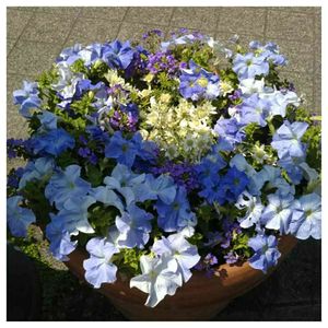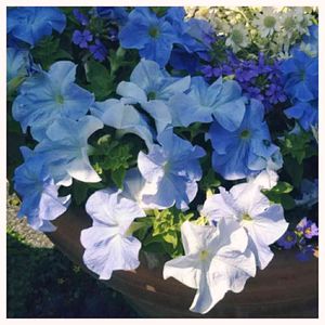 お天気が良すぎて半袖に着替えました👚 朝から寄せ植え✨ 合ってないかな❔ 暫くはこのままで 。✩*:゚・⑅*॰¨̮♡ ゲストはホワイティ-ちゃん♡テキトウ ★エキザカムジュピター ★ツルニチニチソウ ★フランネルフラワーエンジェル スター