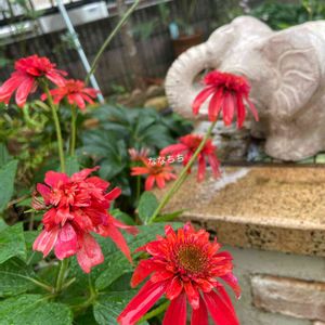 赤いエキナセア はい、名前は忘れました😁 昨年👆まとめ買いの一つ 真ん中に ななちちの文字 !(◎_◎;)いつ?つけた? 消したいけど、面倒だから このままで☝️