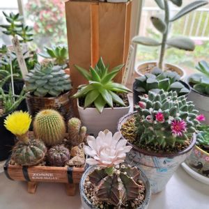 出窓のサボテン達のお花が咲きました🎵😊 外の棚のサボテンも咲いているものがありました❣️😃✨