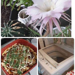 昨日のサボテンの花が🌸雨にうたれながら咲きました。🌵 今日も朝から☂️☂️雨です。 大雨の中新しい洗濯機がもう配達されました。🚚 昨日冷蔵庫も一緒に買いに行って洗濯機だけは急ぐだろうと直ぐ持って来てくれました。(^.^)(-.-) お昼は久しぶりにお好み焼き🍕 コロナもあるし家の中ばかりです。🏠🥪☕🍵