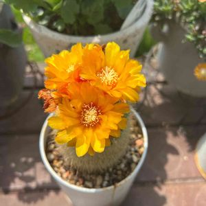 ダイソー産のサボテン。 短毛丸かなぁ、大豪丸かなぁというところ(大豪丸っぽいな) 雨が続くからサボテンたちを軒下に移動中にサボテン棚の中にいるこの子の開花に気づいた(サボテン棚はビニールカバーが被っているから雨関係無し)。