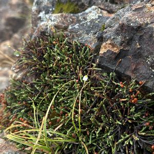 イワヒゲ(岩髭) ツツジ科 高山帯の風の強い岩場の裂け目や礫地に張り付くように生える。 組紐のように見える葉が特徴 鐘形の小さな花が一輪だけ咲いてました🤍 あとは赤い実になってます❣️ 急な岩場を登り、その隙間に見つけた時 こんな高いところに健気に咲く花を見ると頑張れます💪 赤岳(八ヶ岳)2899m山頂付近で
