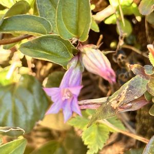 ツルリンドウ 山地の木陰に咲くツルリンドウは薄紫色ですが こちらは陽の当たる斜面でピンク色の花 真っ赤な実もつけてました。 標高2000m近くでは朝夕は気温6〜7度 蕾もあり、まだまだ頑張って咲いていました。