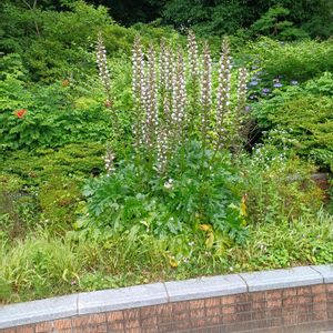 身長を超すほどの花です。ジギタリスっぽいけれど、葉っぱが違うので何だろう?🤔