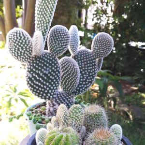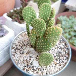 ミッキーみたいなバニーカクタスにウサギの耳が一つニョキニョキと➿😆⤴️ 100均サボちゃんの鉢にバニーカクタスの赤ちゃん植えてにぎやかにしちゃいました✨🐰👯🎶