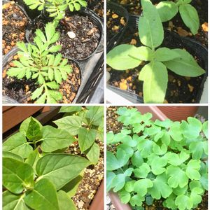 春に蒔いた種の成長記録✏️ 右上から時計回りに 🌱ミニひまわり 🌱オダマキ グリーンアップルズ 🌱オシロイバナ 🌱マリーゴールド