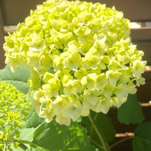 スカビオサ オクロレウカ✨ (スカビオサ ムーンダンス) ほんのりクリーム色💛💚 後ろに写っているのは地植えのアナベル😊✨