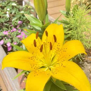 スカシユリの黄色が咲きました😊❣️ ユリは4種類育てていますが 他のも蕾が膨らんでいるので もうすぐ咲くかな😊🎶