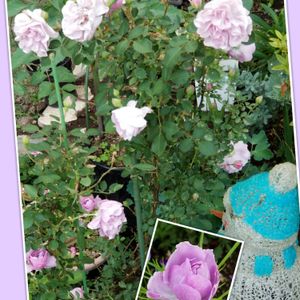 去年からのレイニーブルーさん🌹 留守の間に夫が支柱を立ててくれてました♡。